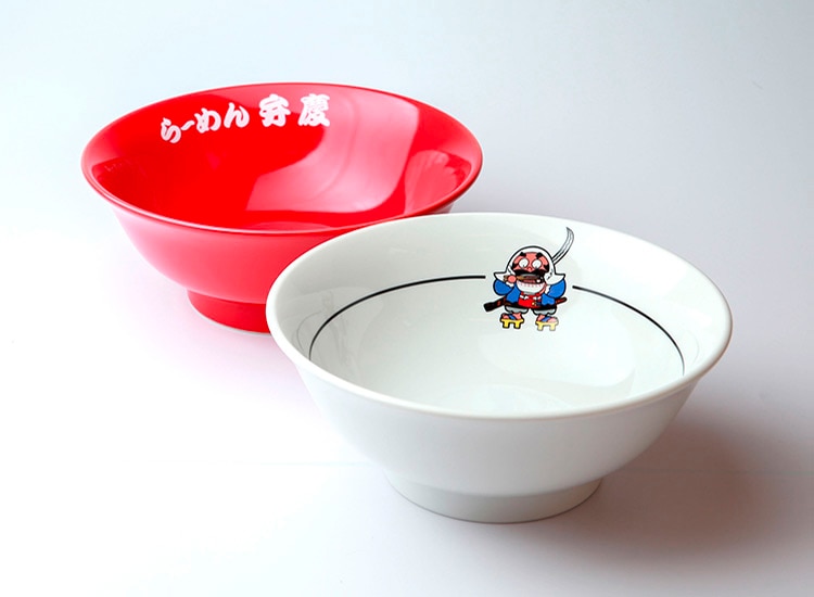 弁慶の人気キャラクター「弁慶ちゃん」の丼2個(赤白)と、